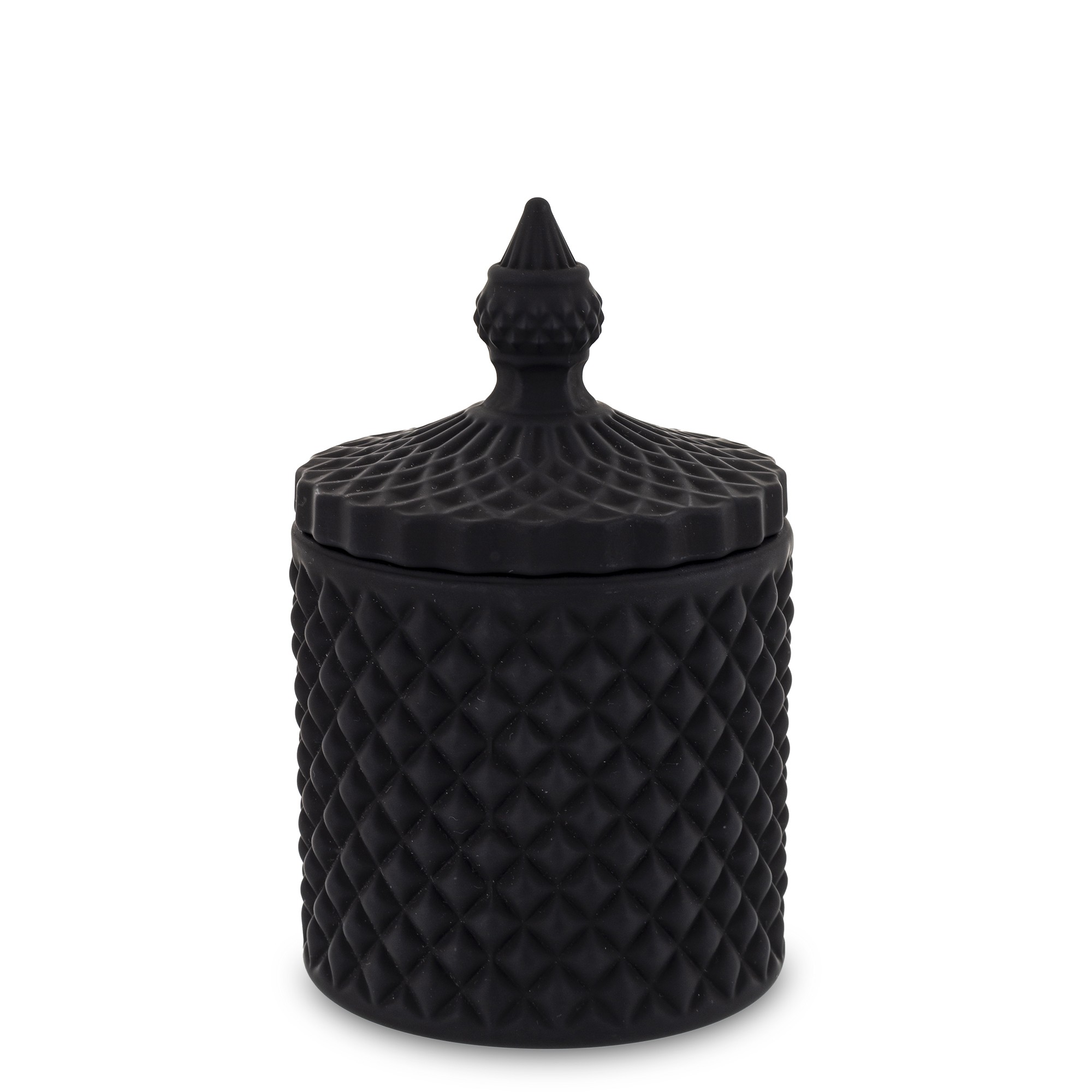 Štýlová matná čierna nádoba s výrazným reliéfnym vzorom a elegantným viečkom. Perfektná na uloženie drobností, šperkov či sladkostí – dodá vášmu domovu moderný a luxusný charakter.