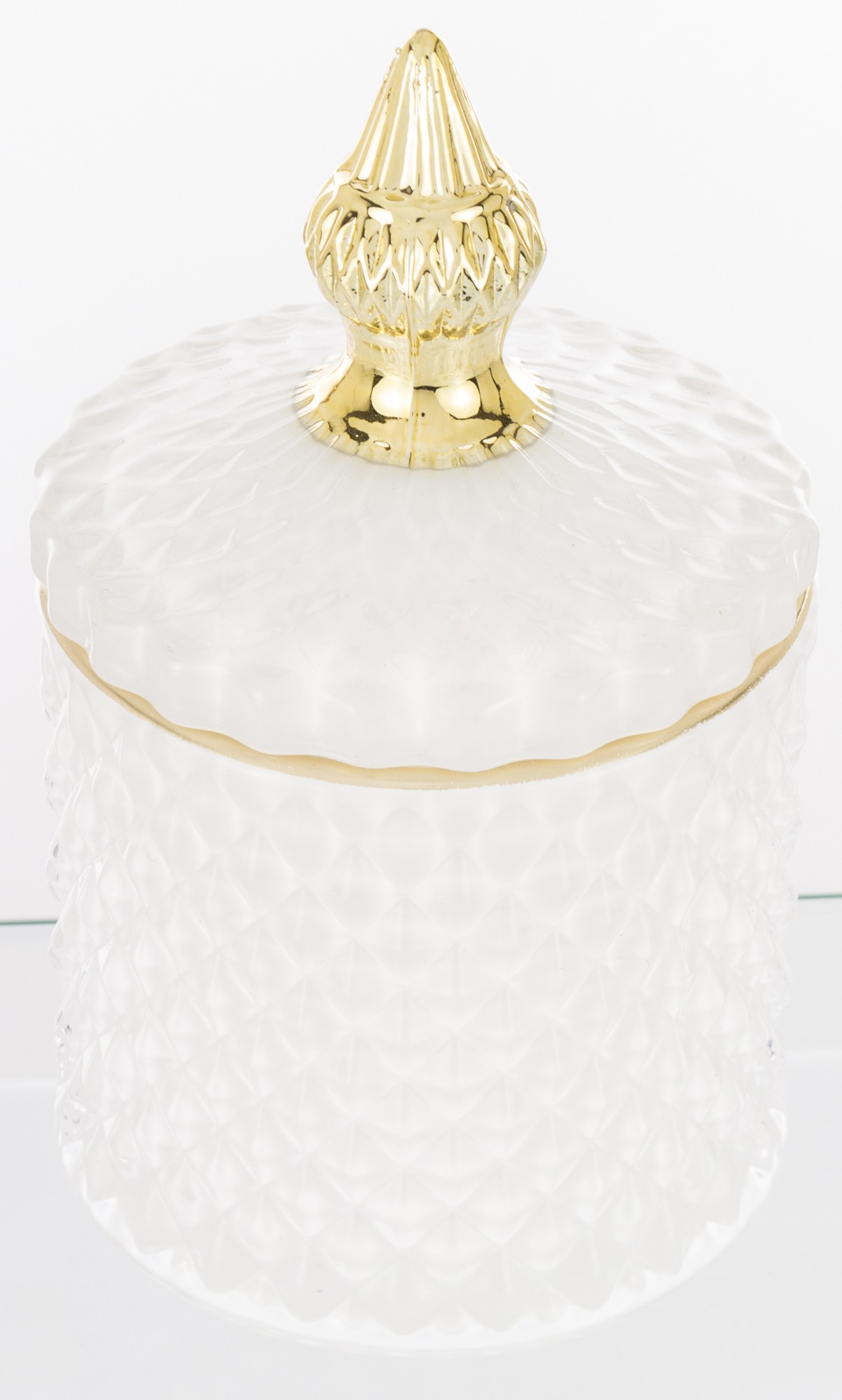 Luxusná biela dekoratívna nádoba so zlatým ozdobným viečkom a elegantným reliéfnym vzorom. Ideálna na sladkosti, šperkyči drobné dekorácie – dodá vášmu domovu čistý, jemný a glamour vzhľad.