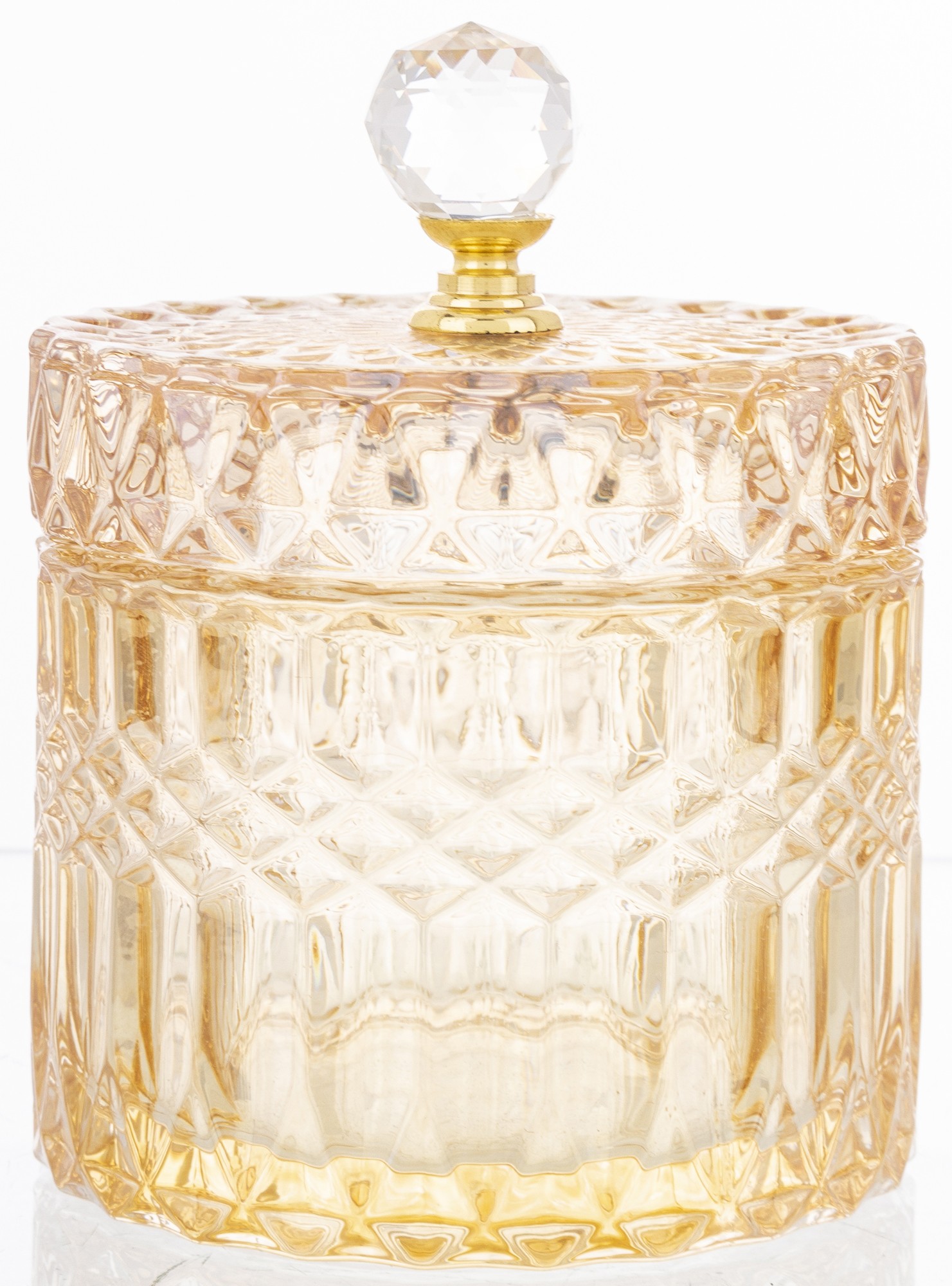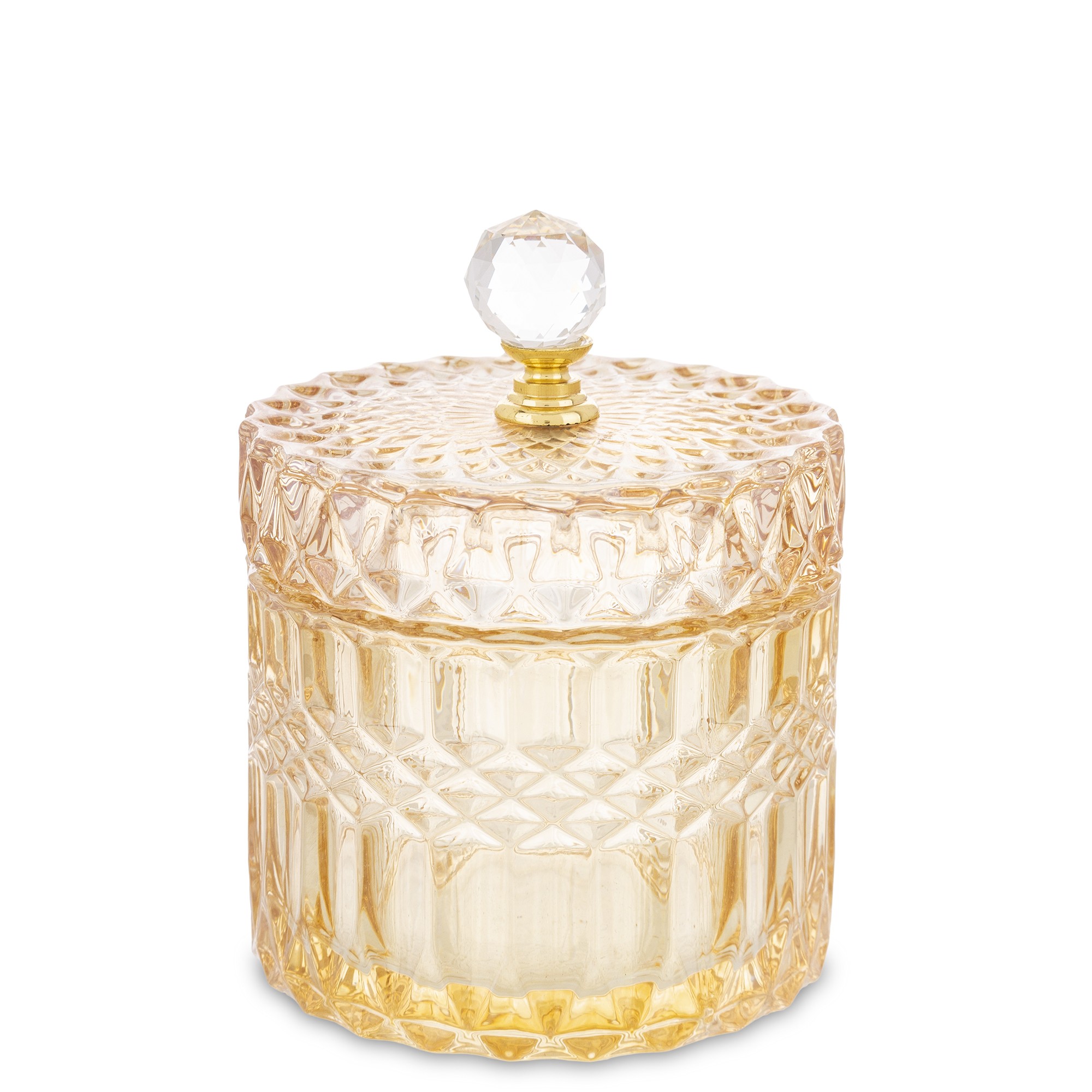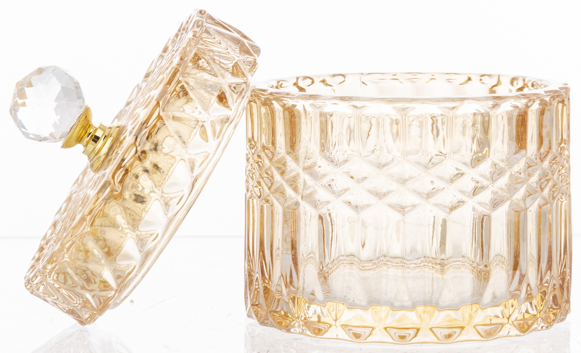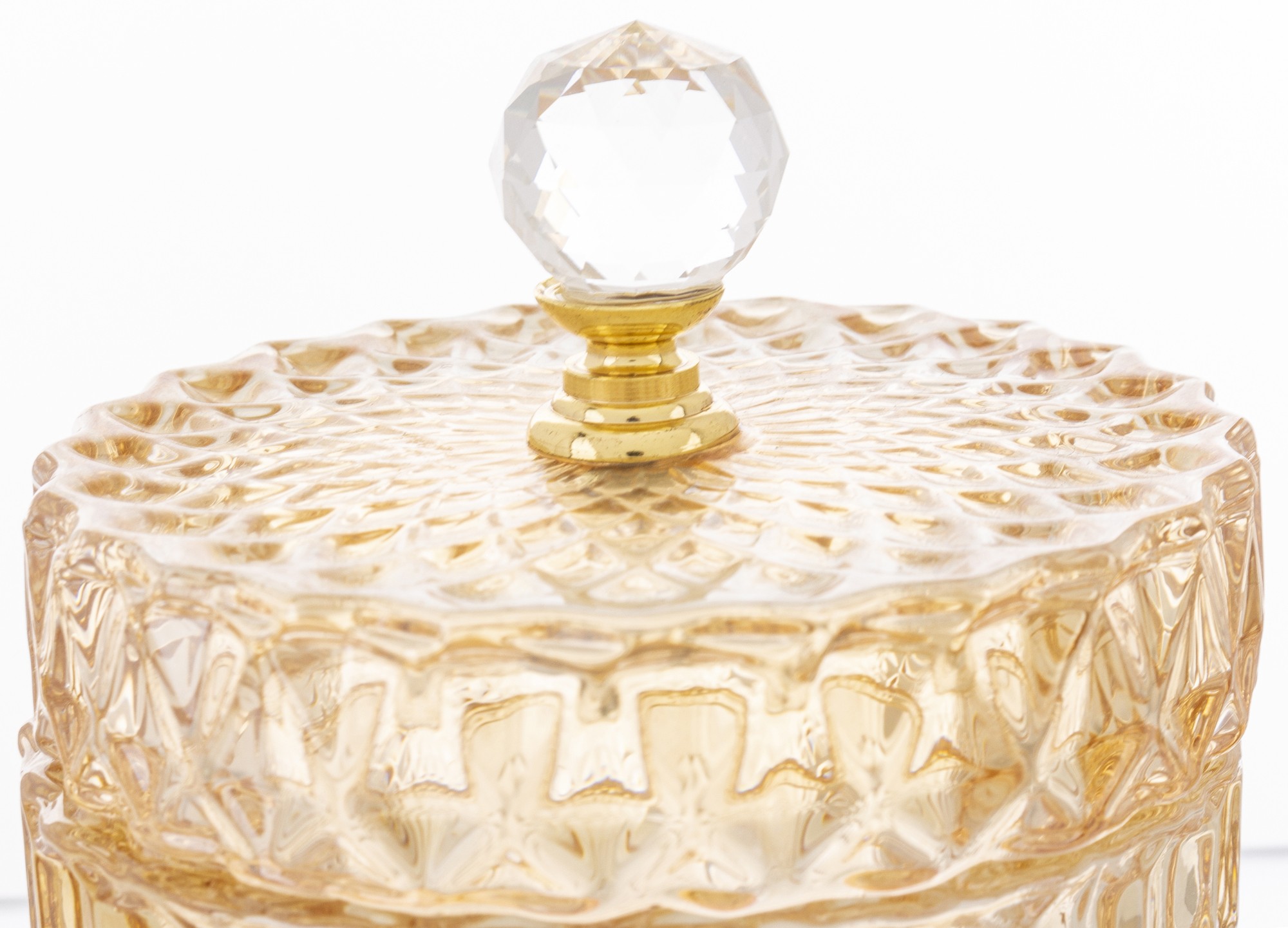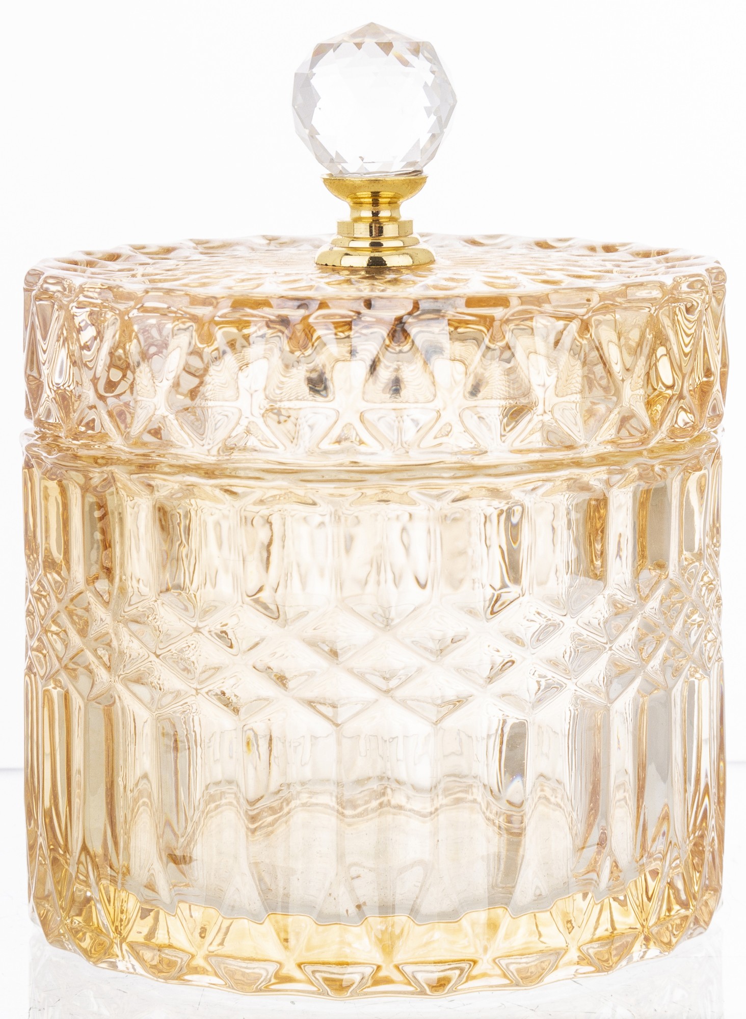 Elegantná sklenená nádoba s luxusným brúseným dizajnom a zlatým vrchnákom je dokonalým doplnkom pre každý interiér. Ideálna na odkladanie sladkostí, vatových tampónov, šperkov či drobností, ktoré chceš mať vždy po ruke. Dodá tvojmu domovu šmrnc elegancie a prémiový vzhľad.