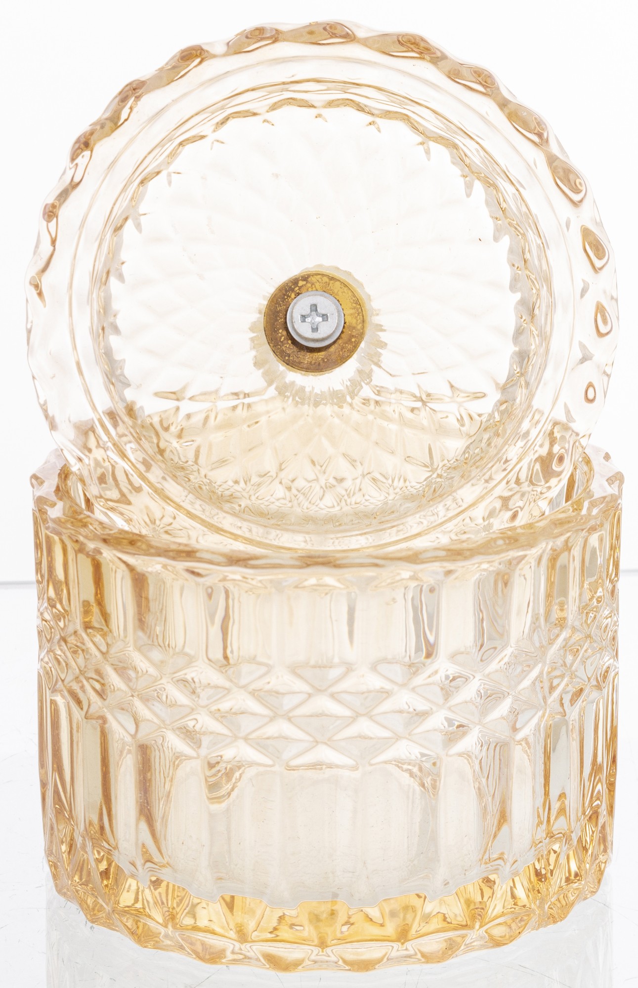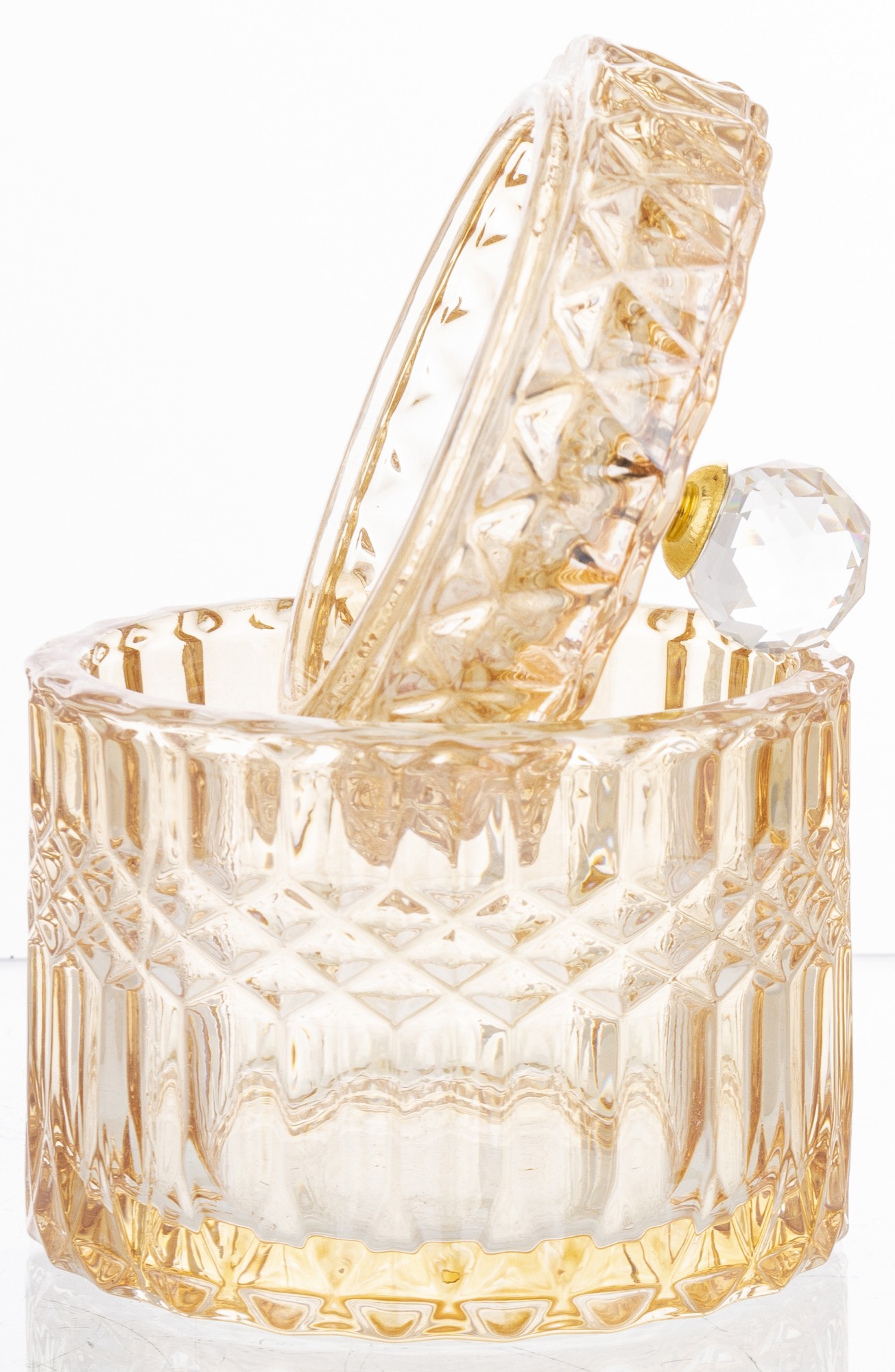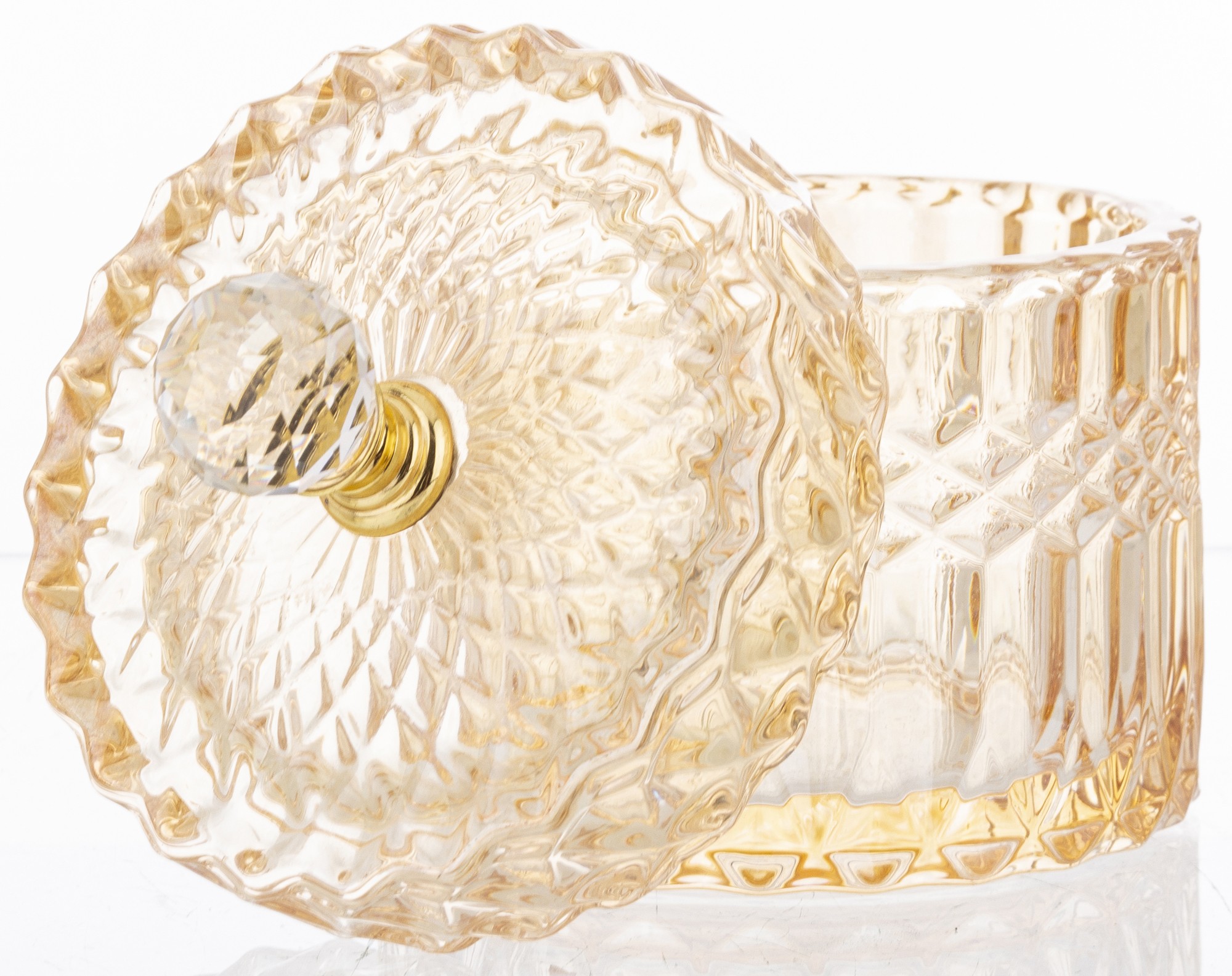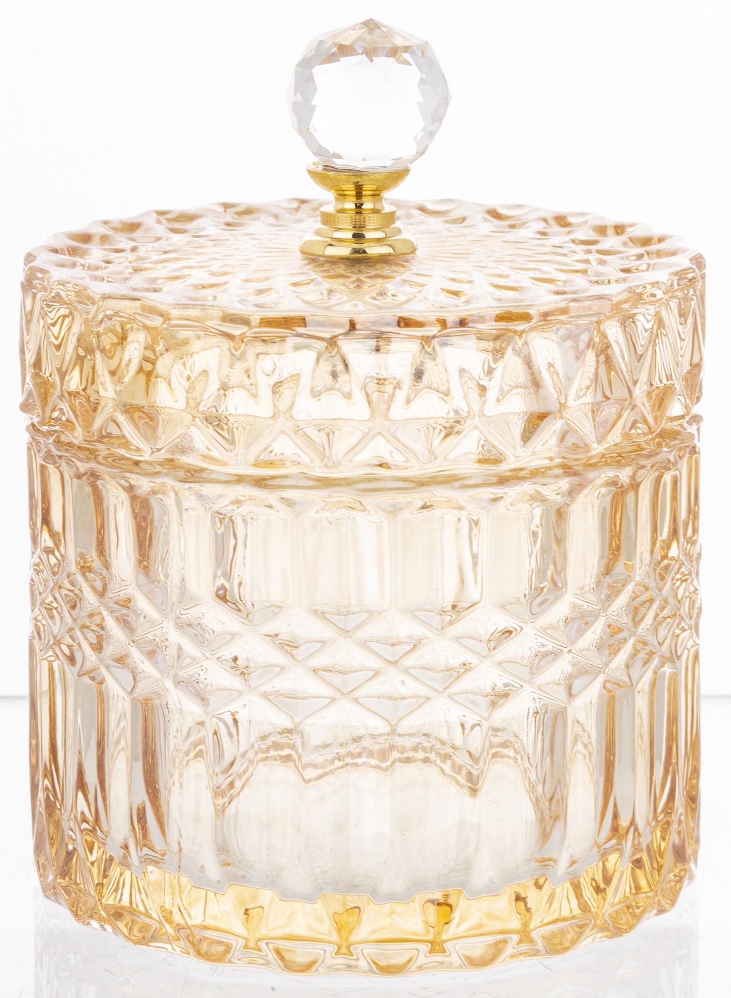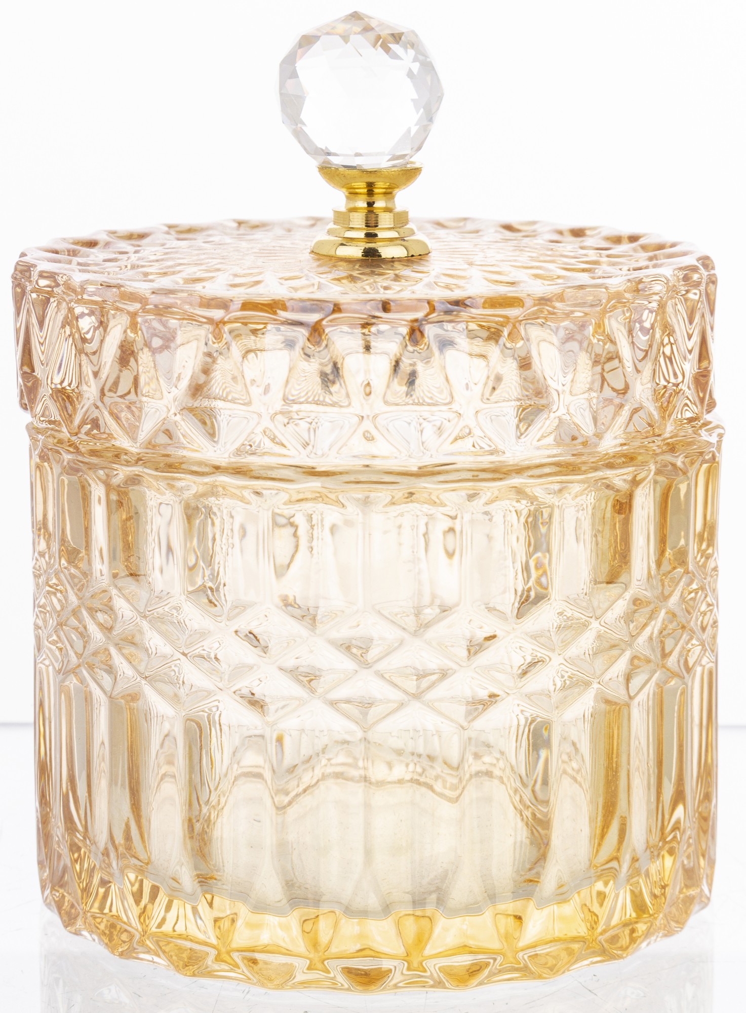 Elegantná sklenená nádoba s luxusným brúseným dizajnom a zlatým vrchnákom je dokonalým doplnkom pre každý interiér. Ideálna na odkladanie sladkostí, vatových tampónov, šperkov či drobností, ktoré chceš mať vždy po ruke. Dodá tvojmu domovu šmrnc elegancie a prémiový vzhľad.