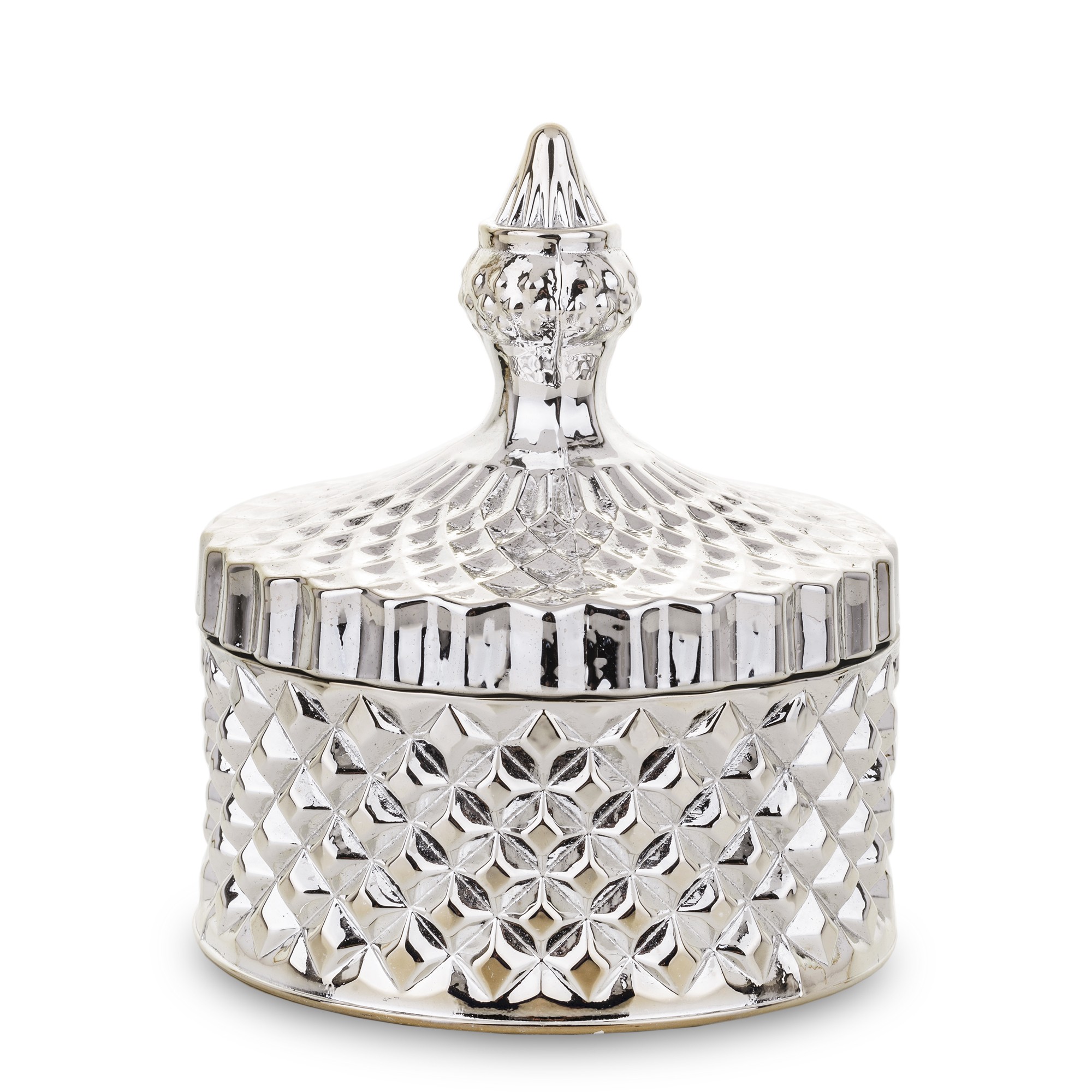 Luxusná strieborná dekoratívna nádoba s reliéfnym vzorom a elegantným viečkom. Perfektný doplnok na sladkosti, šperky či drobné dekorácie, ktorý okamžite dodá vášmu domovu glamour a eleganciu.