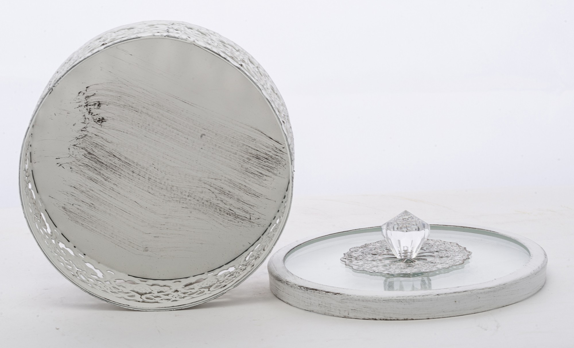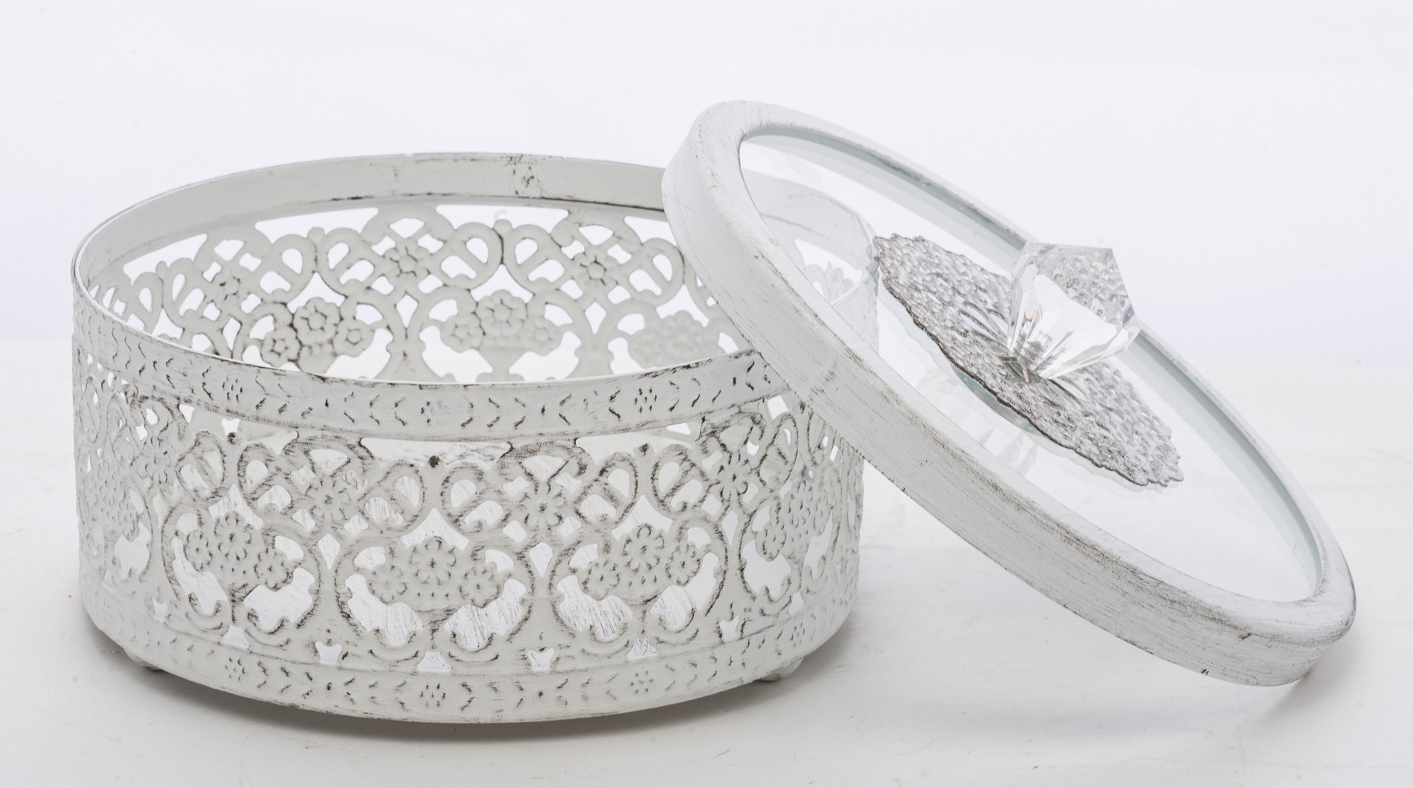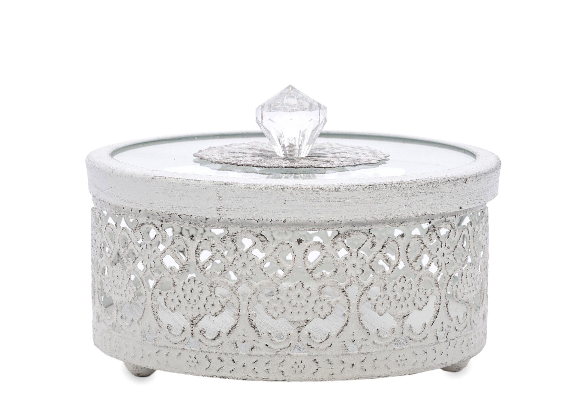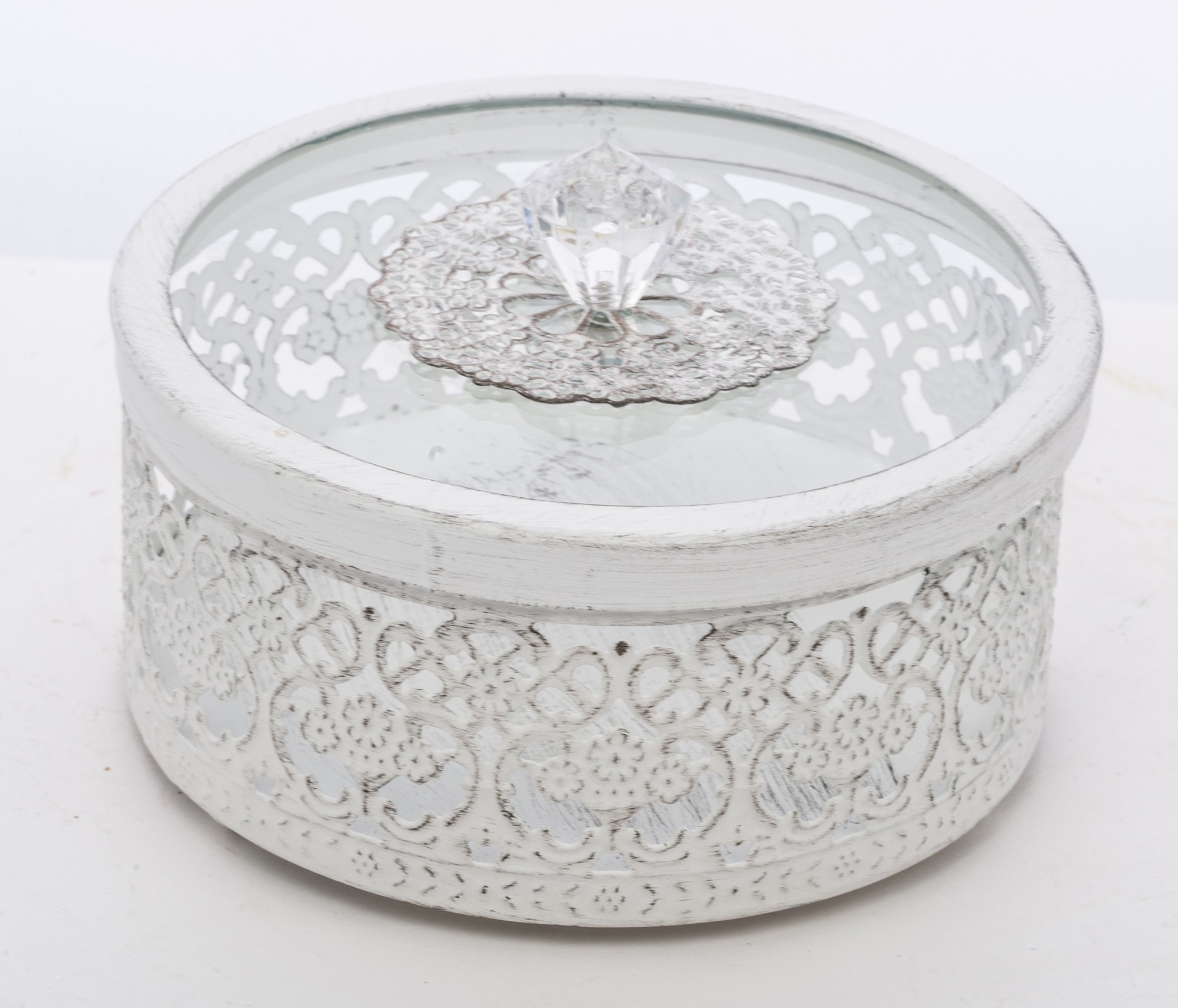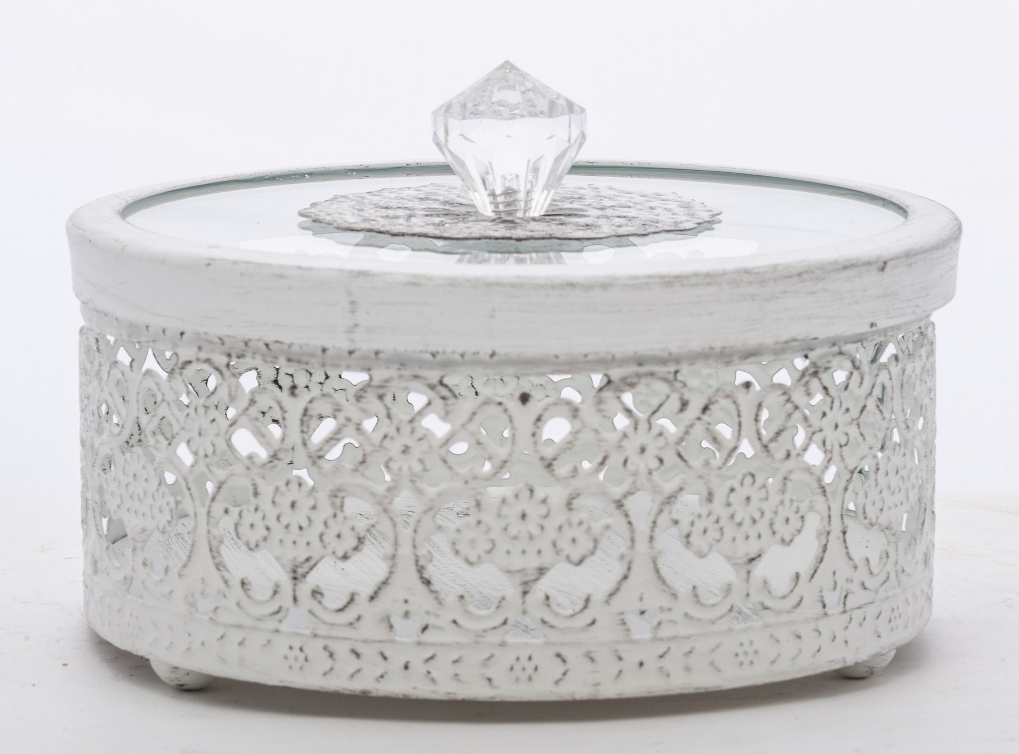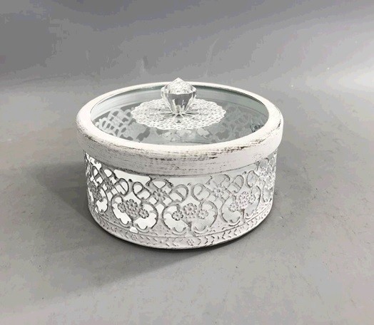 Štýlová okrúhla dekoratívna nádoba, ktorá zaujme jemným čipkovým vzorom a elegantným priesvitným vekom. Ideálna na šperky, drobnosti alebo ako vkusný doplnok na poličku či toaletný stolík. Ľahká, praktická a zároveň dostatočne výrazná, aby dodala priestoru romantický a čistý charakter.