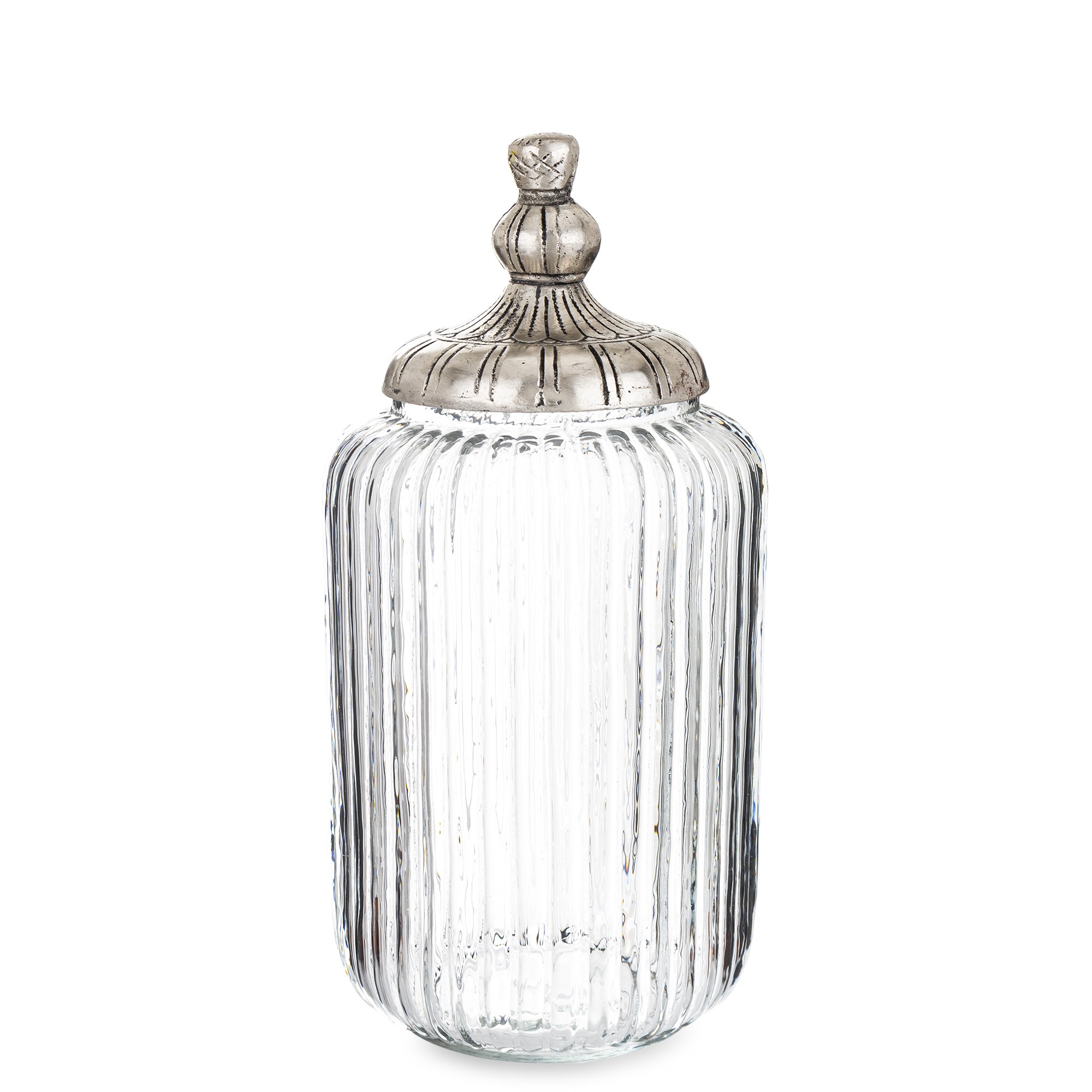 Vysoká slenená nádoba s jemným ryhovaným dizajnom a ozdobným viečkom. Ideálna na sladkosti, kozmetiku či drobné dekorácie a dokonalé doplní každý štýlový interiér.