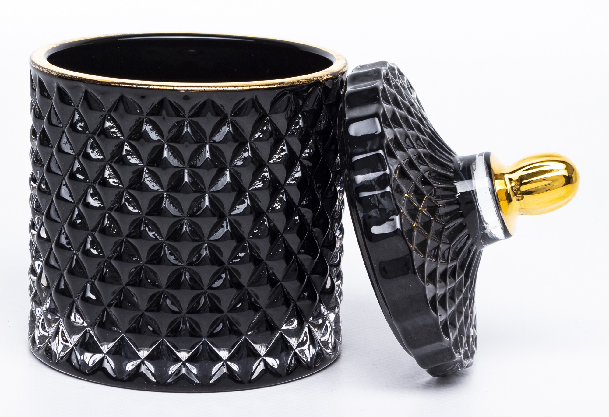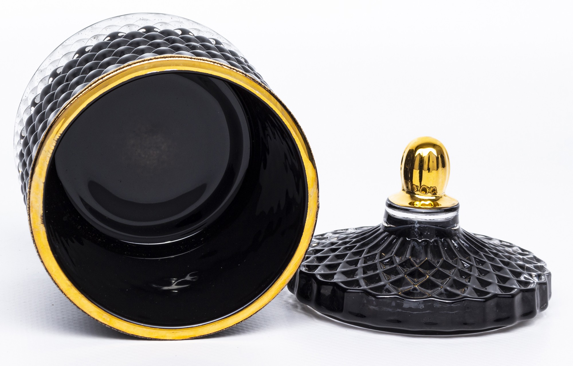 Minimalistická čierna sklenená nádoba so zlatým viečkom a vrúbkami, ktorá dodá interiéru čistý a luxusný vzhľad. Ideálna na sladkosti, drobnosti či ako štýlový dekoratívny doplnok do každej domácnosti.