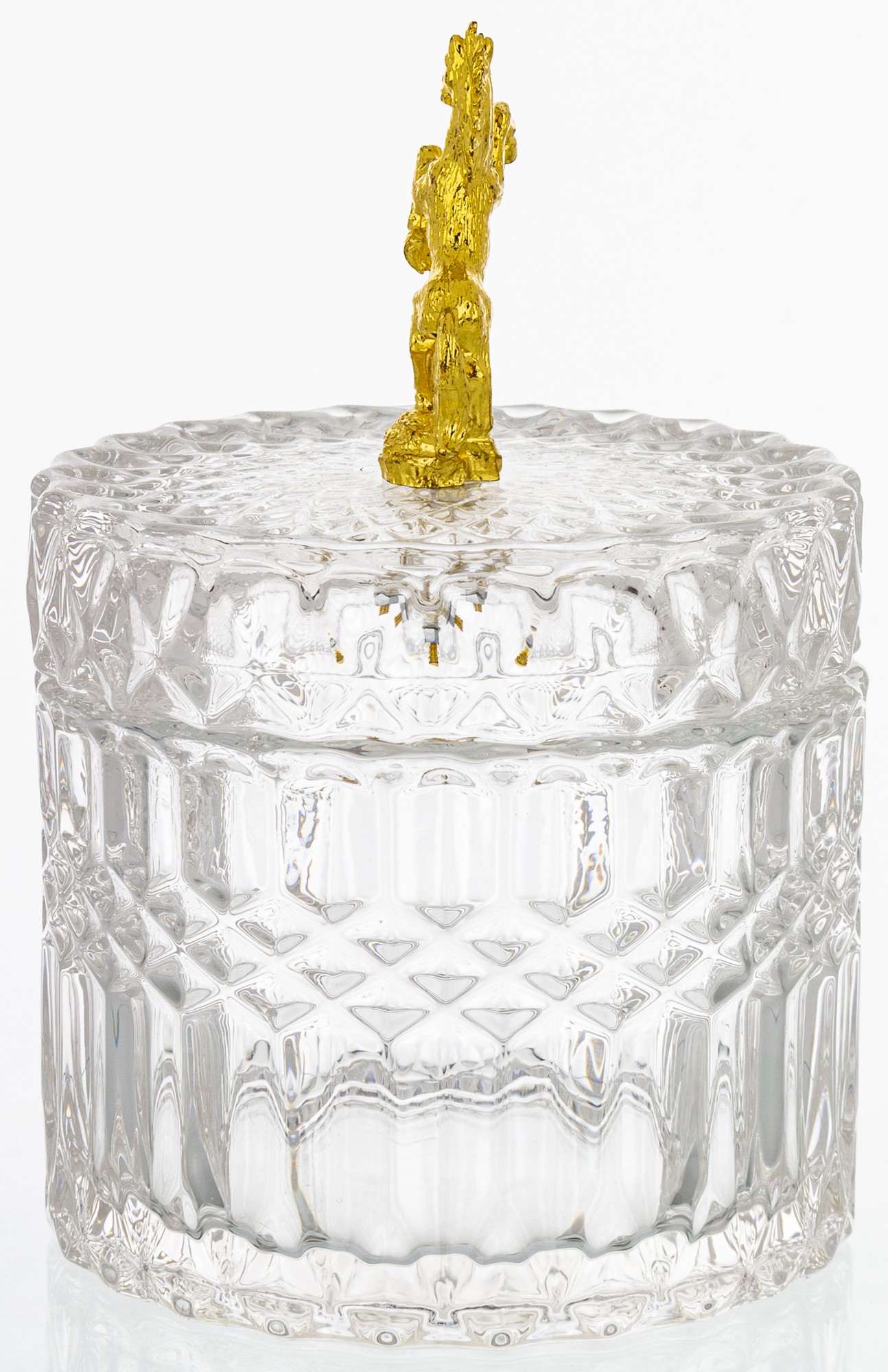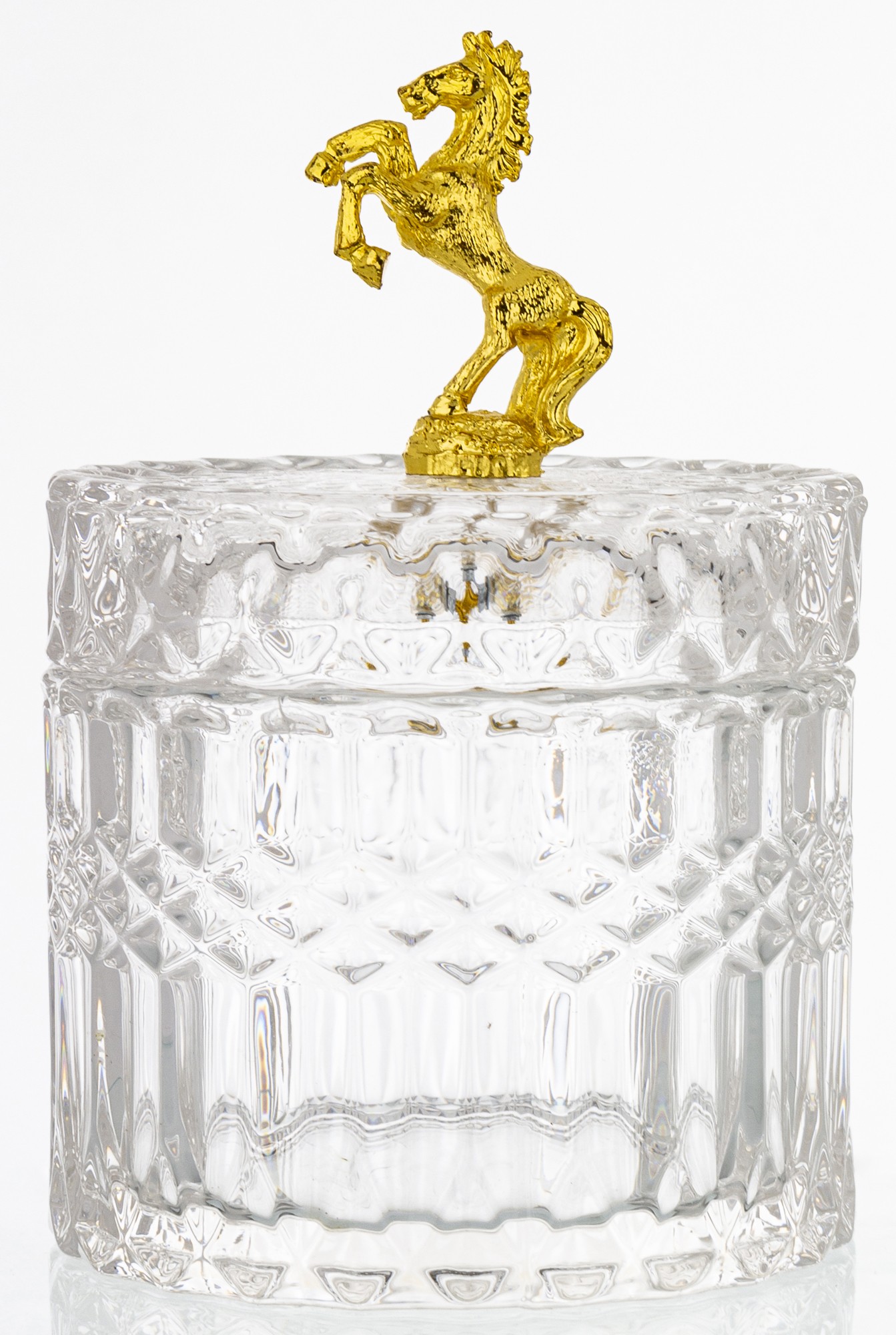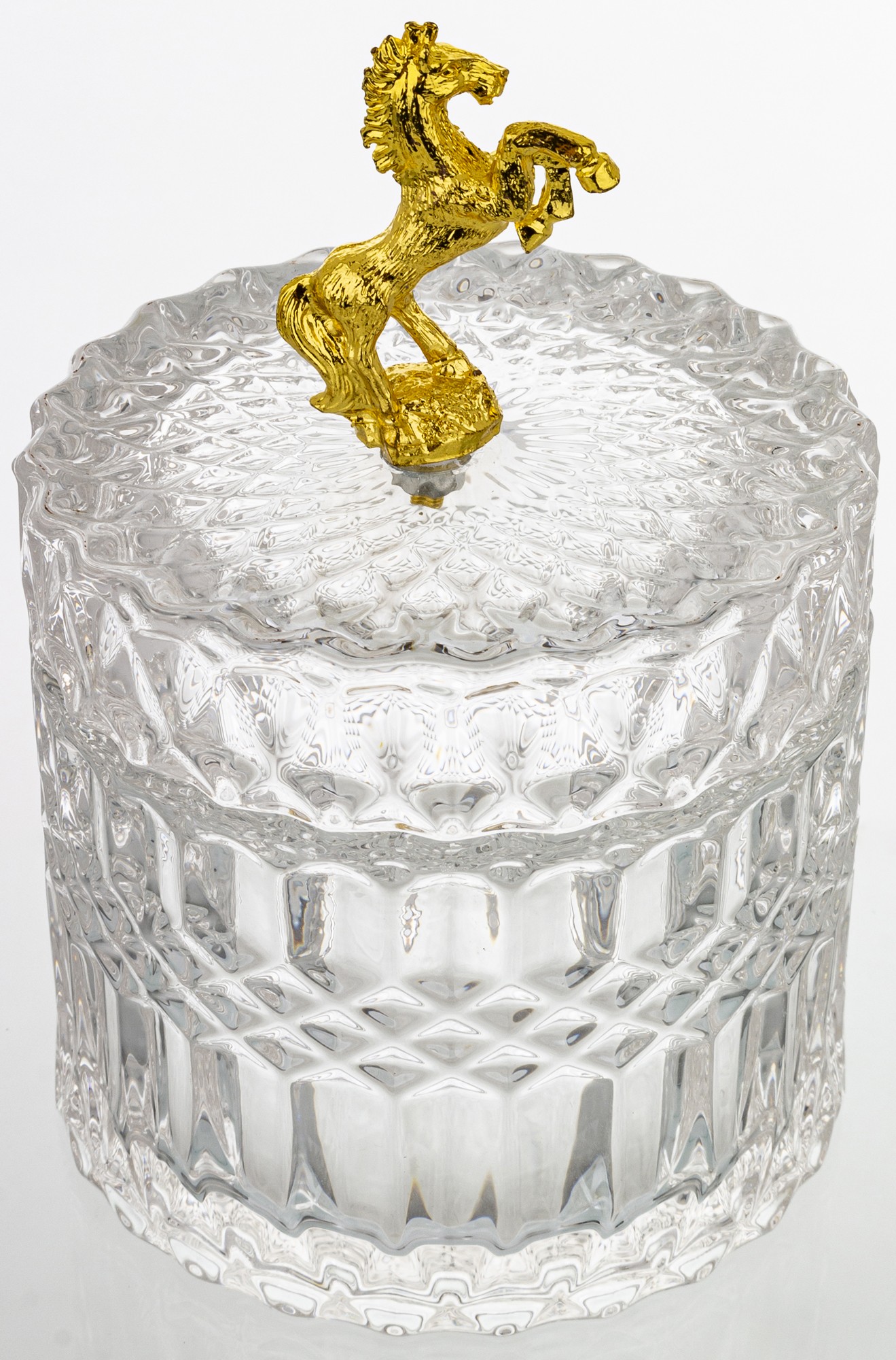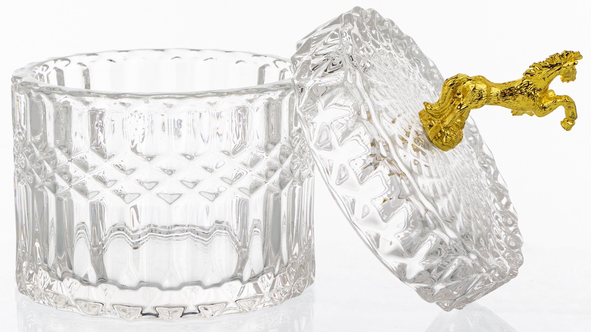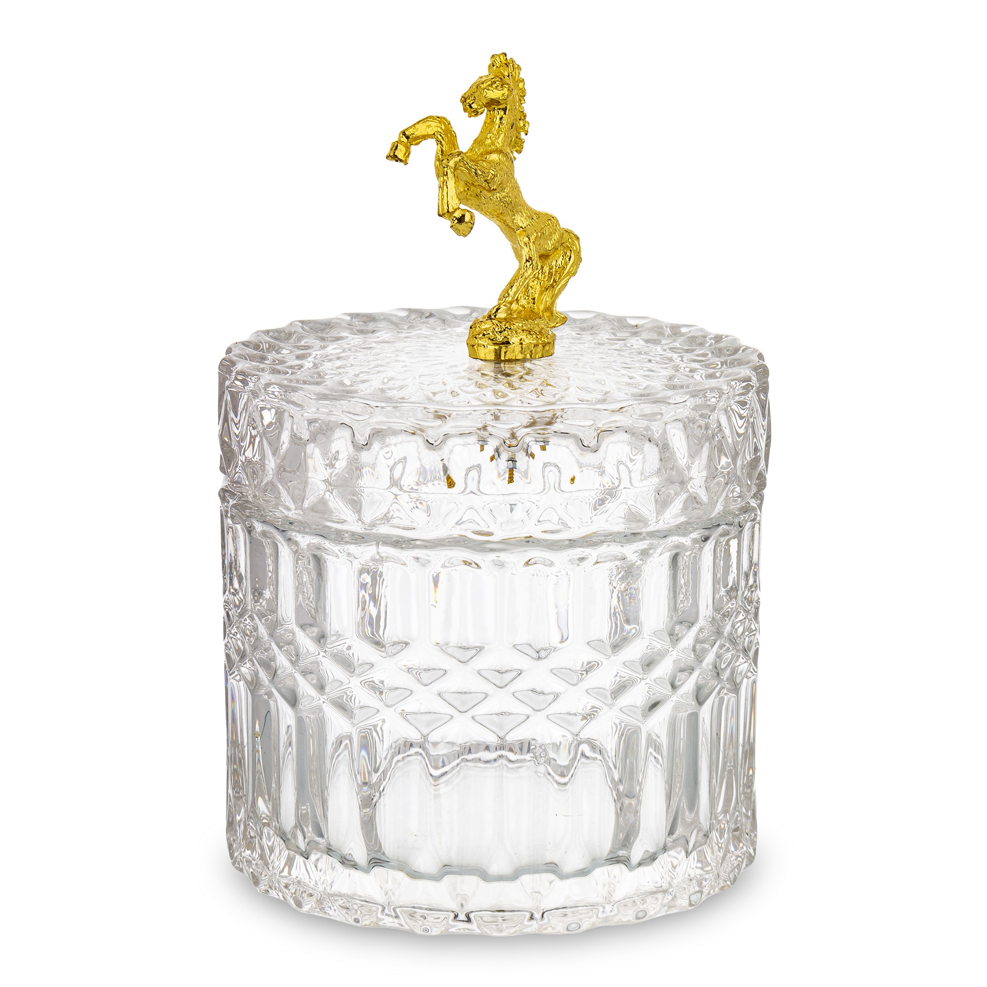 Elegantná sklenená nádoba v luxusnom prevedení so zlatým viečkom a detailným motívom koňa. Kombinácia krištáľovo čistého skla a lesklého zlata dodá tvojmu domovu nádych noblesy. Ideálny na sladkosti, šperky, drobnosti alebo ako štýlová dekorácia do obývačky či kuchyne.