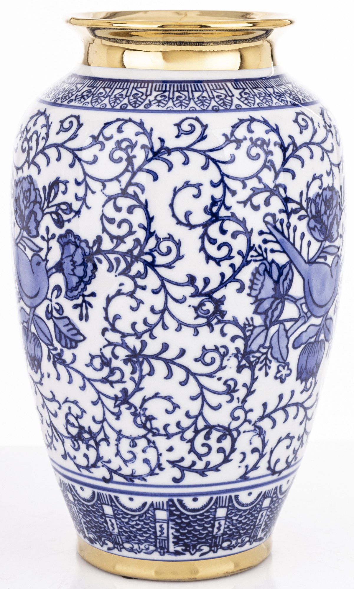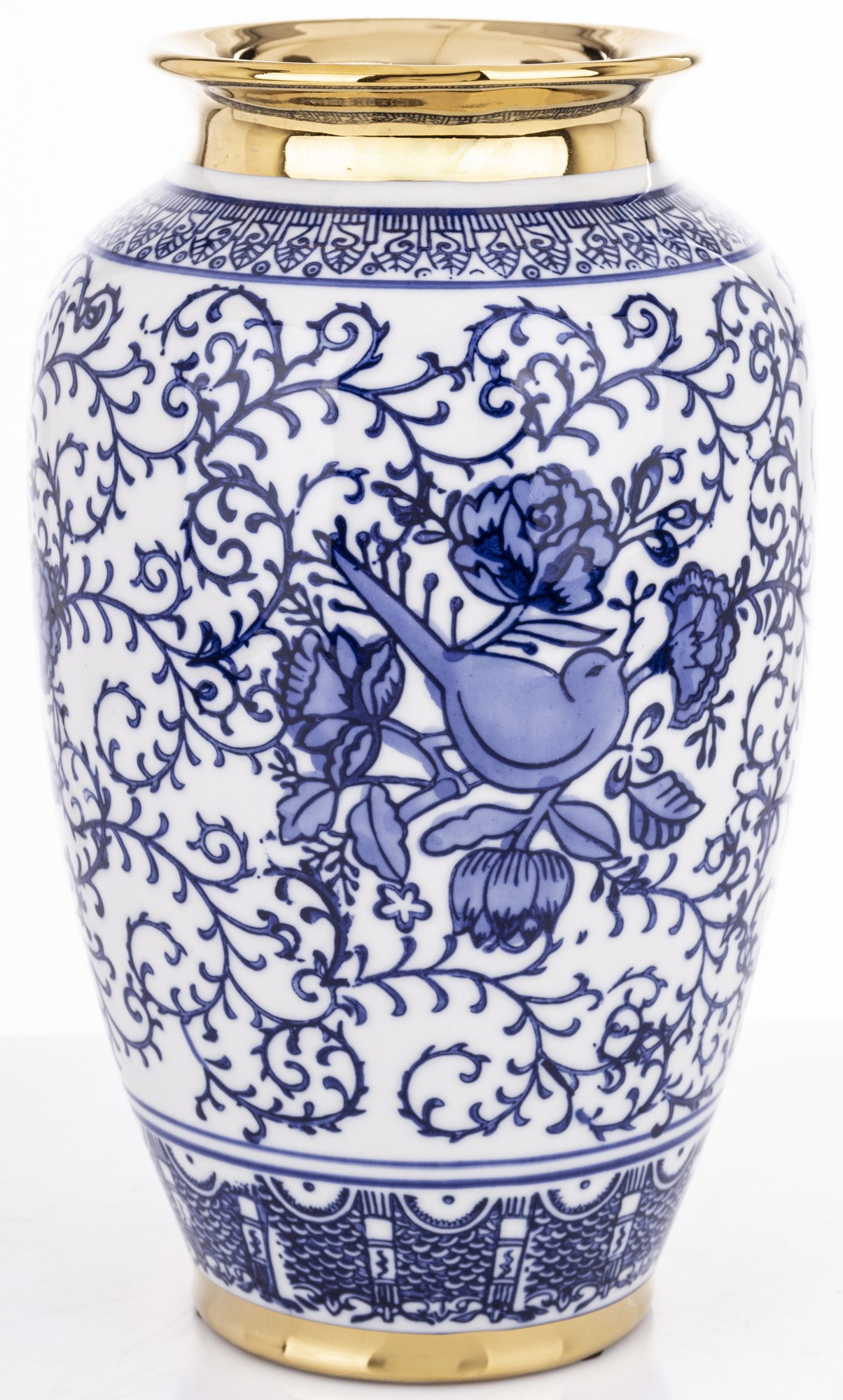 Štýlová keramická amfóra s tradičným modro-bielym ornamentom a zlatým viečkom dodá každému interiéru nádych noblesy. Detaily kvetinových motívov pôsobia jemne a elegantne. Kvaliné prevedenie z nej robia ideálny doplnok do moderného aj klasického priestoru.