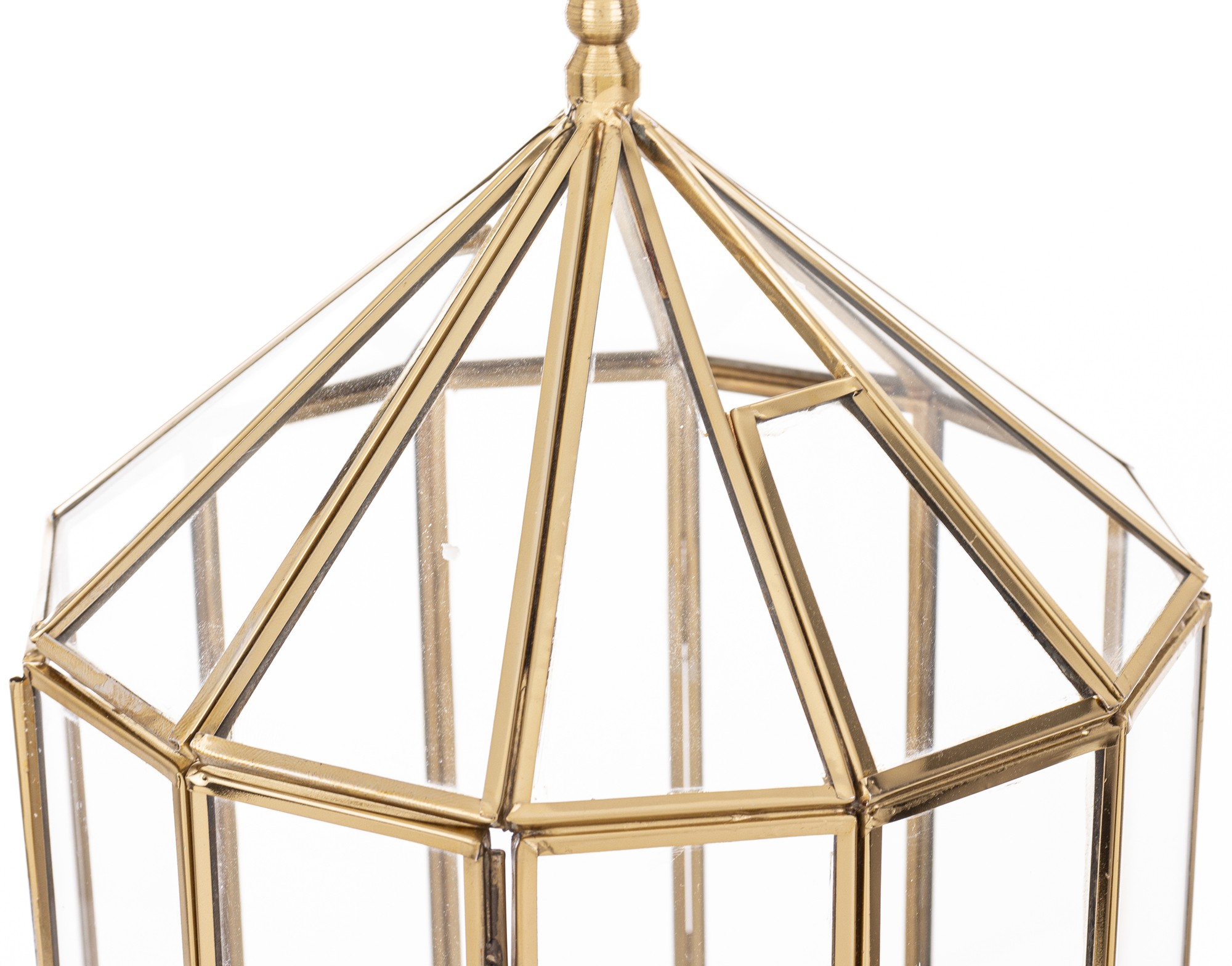 Śtýlový sklenený lampáš so zlatým kovovým rámom je dokonalým doplnkom pre vytvorenie príjemnej a útulnej atmosféry. Jeho geometrický tvar pripominajúci jemnú architektúru pôsobí moderne a zároveň luxusne.