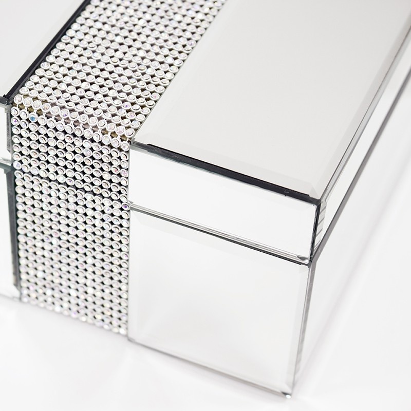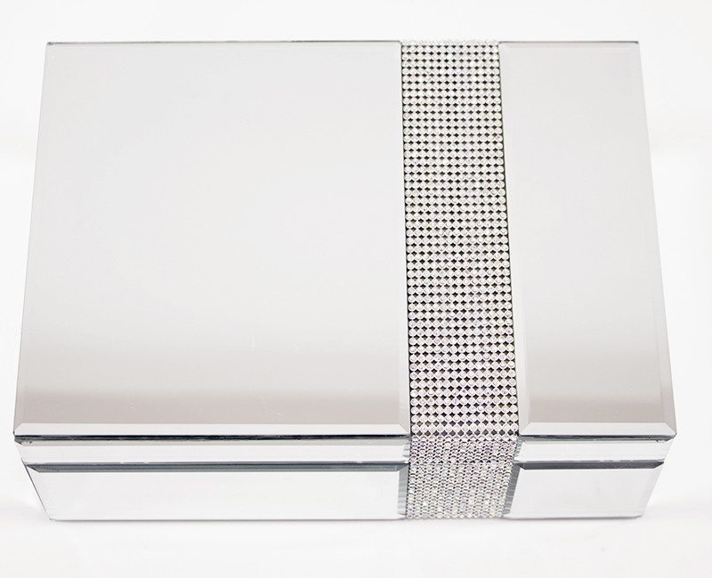 Elegantná zrkadlová šperkovnica s glamour leskom a dekoratívnym pásom, ideálna na štýlové uschovanie šperkov a drobností. Moderný dizajn dodá interiíru luxusný a sofistikovaný nádych.