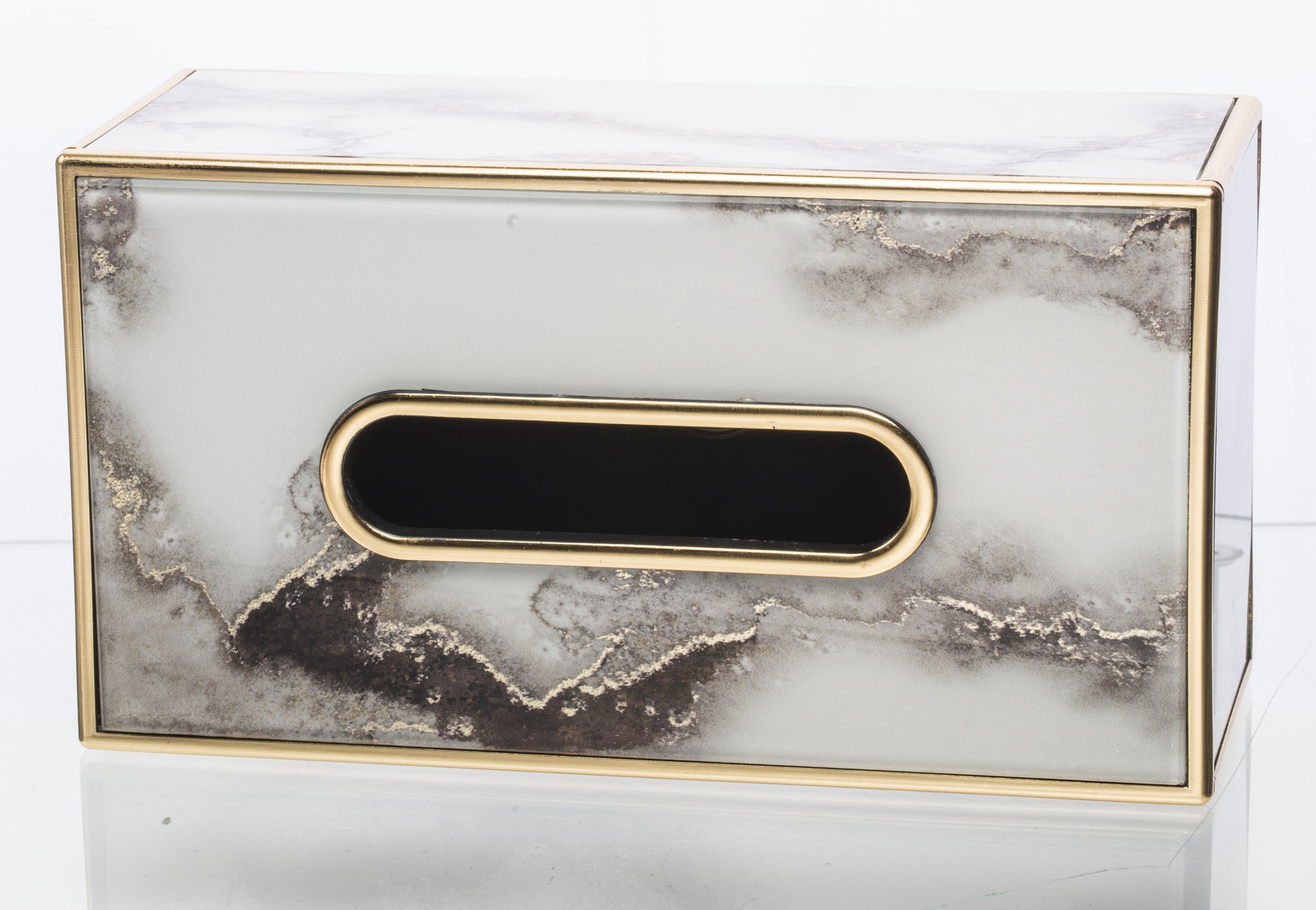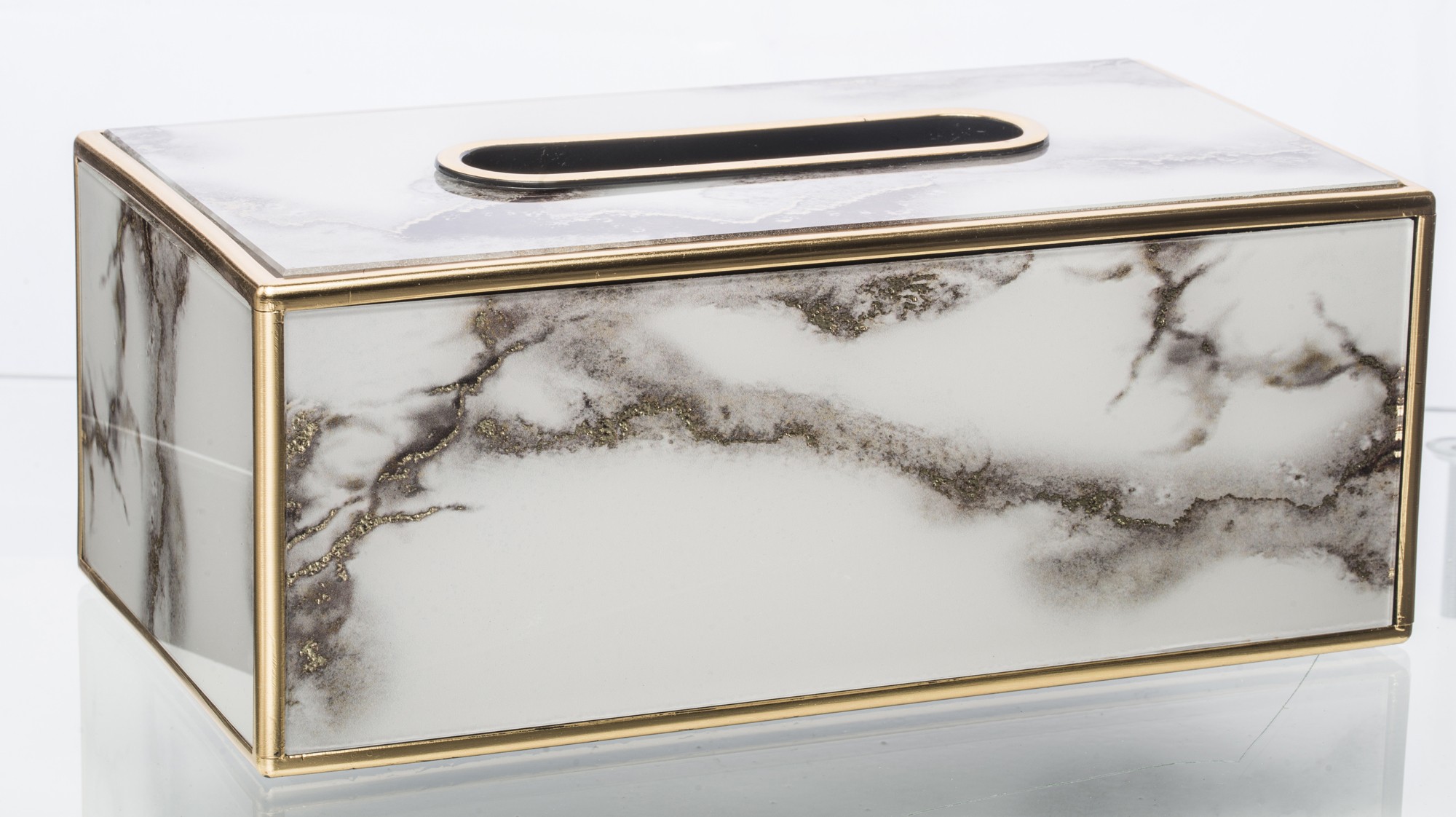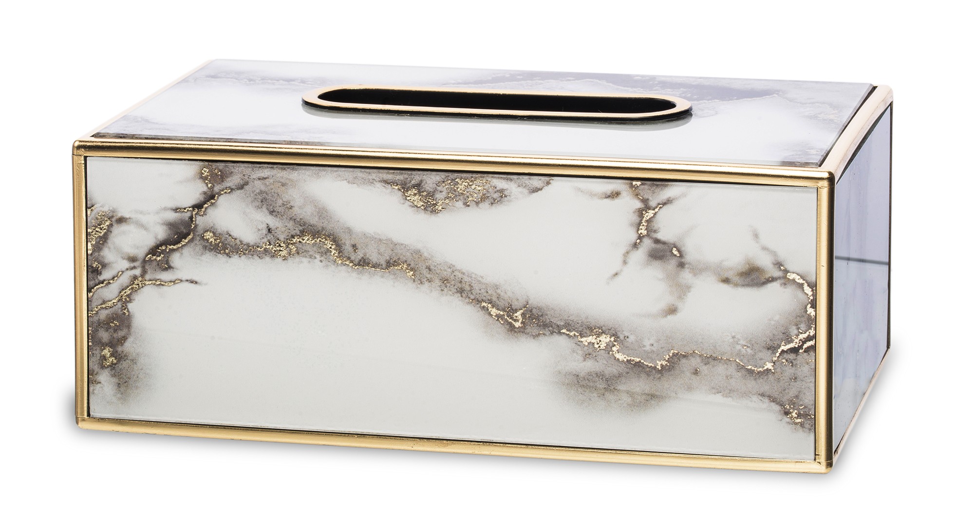 Śtýlová krabička na servítky v modernom mramorovom dizajne so zlatými detailami, ktorá elegantne doplní vašu obývačku, kuchyňu či nočný stolík. Praktický a zároveň luxusný doplnok každého interiéru.