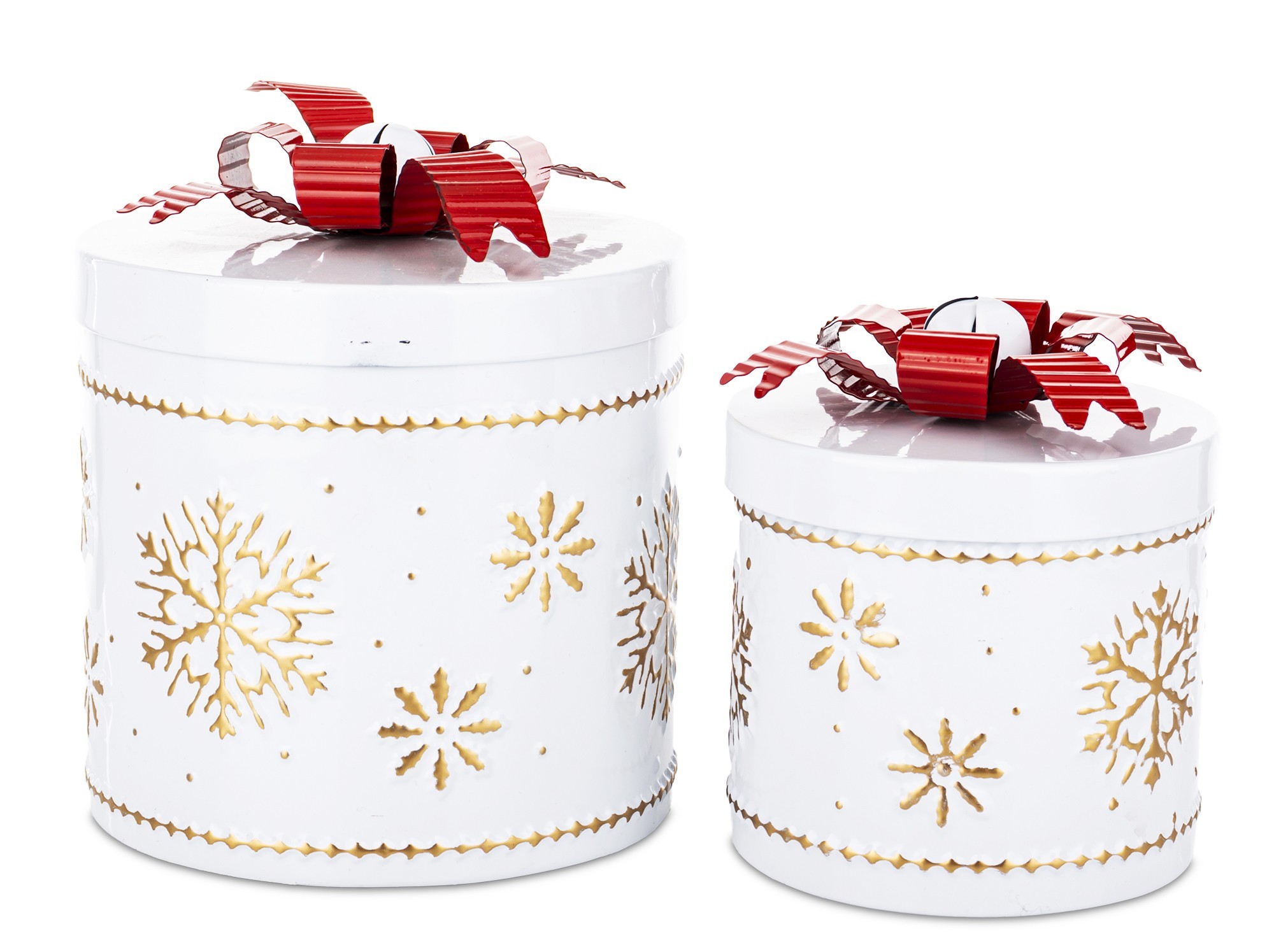 Elegantná sada dvoch pevných dekoratívnych krabíc v bielej farbe so zlatými snehovými vločkami a výraznou červenou mašlou na vrchnáku. Ideálne na balenie darčekov, vytváranie vianočných aranžmánov alebo štýlové uskladnenie drobností. Krabice dodajú domou sviatočnú atmosféru a ploslúžia aj ako krásna dekorácia.
