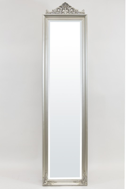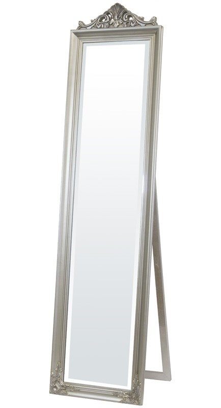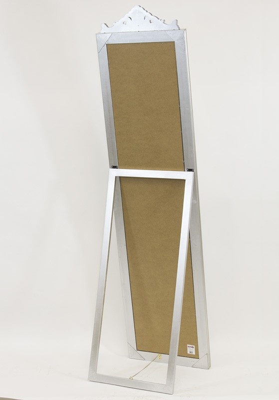 Veľké stojanové zrkadlo so strieborným ozdobným rámom